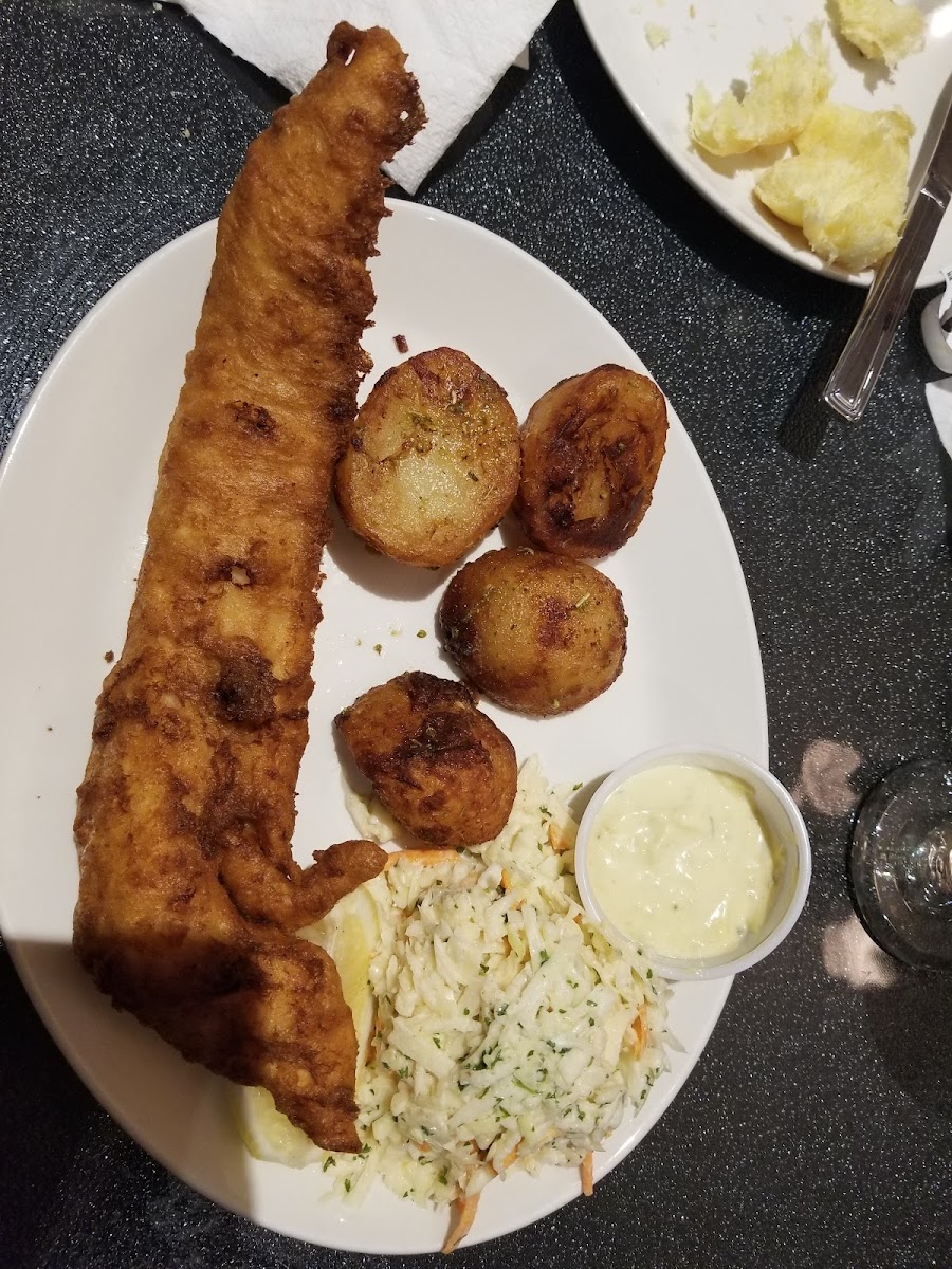 “This restaurant was recently recommended to us. Here we were for the first time. Service was excellent after waiting only about five minutes to get in. They even have a shelter to wait in outside, if it's bad weather. Once in we were served quickly. Menus is simple and straight forward, place under a glass table top. Started with a glass of Sangria for both of us and an appetizer of Caesar Salad, which was enough for both of us, tasty and fresh. We ordered their specialty, which was the Fish and Chips (Single Piece), which came with a quarter of lemon, Tartar Sauce, and a side of Cole Slaw, needless to say plenty of home made fries. No frozen food here. Definitely good value for your money here.”